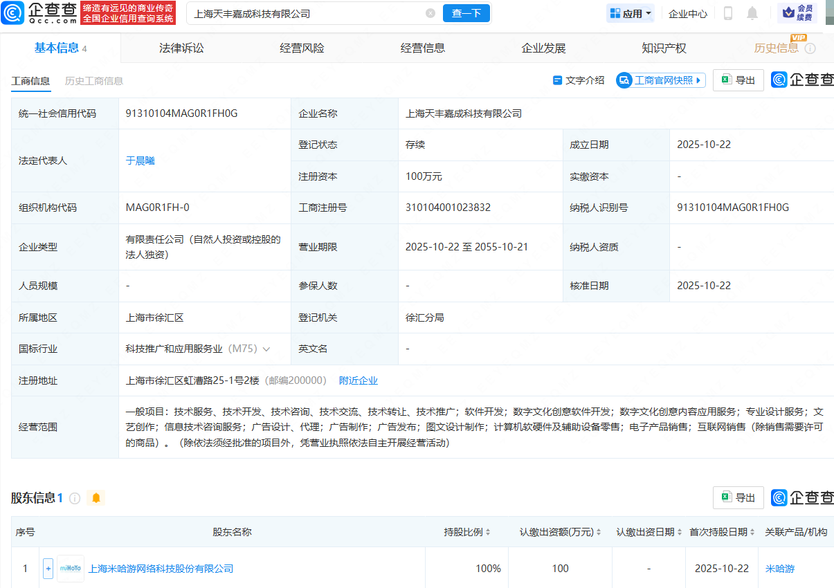 近日,上海天丰嘉成科技有限公司成立,法定代表人为于晨曦,经营范围包含:数字文化创意软件开发;数字文化创意内容应用服务;专业设计服务;文艺创作;信息技术咨询服务等。企查查股权穿透显示,该公司由上海米哈游网络科技股份有限公司全资持股。