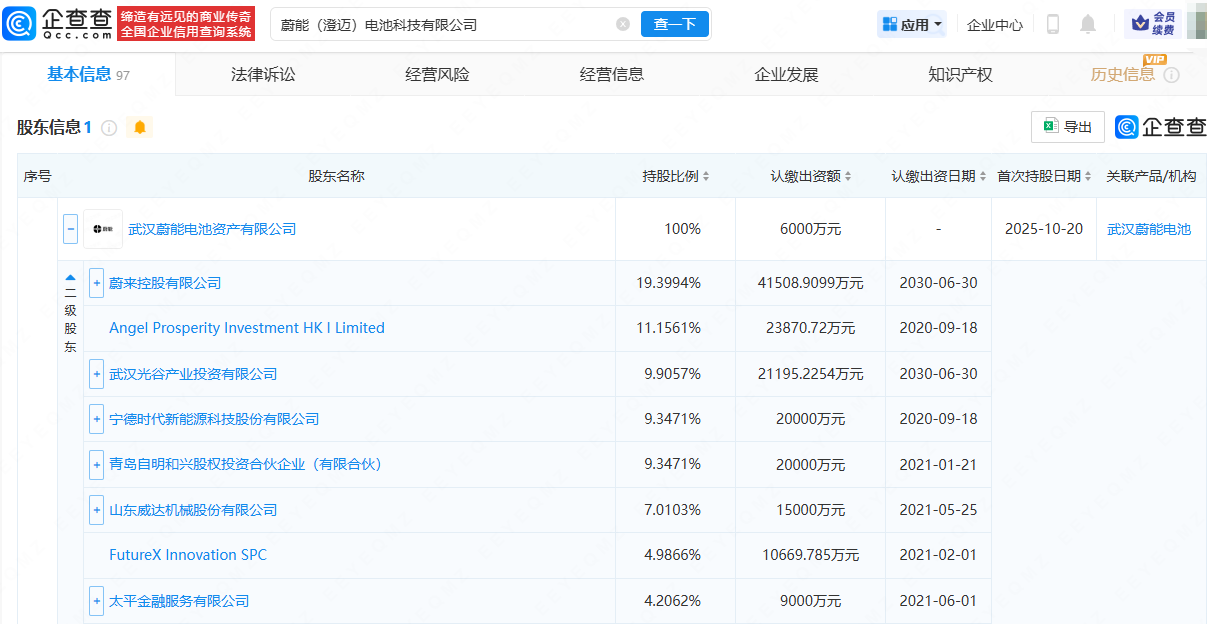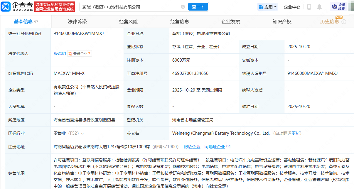 近日,蔚能(澄迈)电池科技有限公司成立,法定代表人为赖晓明,注册资本为6000万元,经营范围包含:电动汽车充电基础设施运营;蓄电池租赁;储能技术服务;电池销售;电池零配件销售等。企查查股权穿透显示,该公司由武汉蔚能电池资产有限公司全资持股,后者由蔚来控股有限公司、宁德时代(300750)等共同持股。